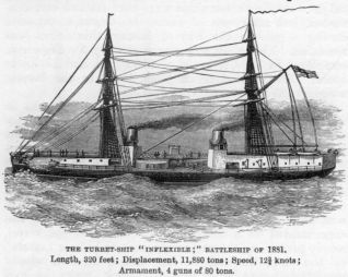 Turret-ships, as first constructed, were very heavily, armoured, and in consequence rather unseaworthy. Being intended for coast defence only, they always had a harbour available in bad weather, and sails were not required as they were never far from a coal supply.