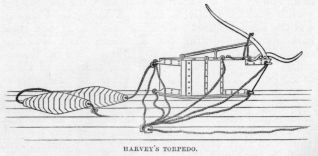 Torpedoes were of three kinds: the first were really submarine mines, and were placed in a river channel, being fired by electricity when the vessel came over them. The second kind was the floating or Harvey’s torpedo, consisting of a long narrow, but deep wooden case from 44 to 60 inches in length, which contained 30 to 80 pounds of gunpowder, inside a copper lining. It had two levers projecting on the outside, which, on striking an object, set off the explosive inside. This torpedo was used in two ways: the first by setting it adrift on a river, or where there was a well-marked current setting towards the enemy’s ships, when the current carried it to its destination; the other way was by towing it at night, by means of a long line, across the bows of an enemy’s ship; it exploded whenever it came in contact with the ship.