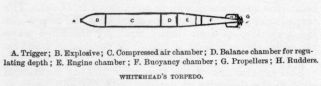 Torpedo attack, however, has been revolutionised by the invention of “Whitehead’s torpedo,” which can be used from a distance. In shape it is exactly like a huge cigar, 12 to 18 inches in diameter, and 6 to 10 feet long. At the head is the explosive; behind this is a reservoir containing air compressed to an enormous pressure, which drives engines contained in a third compartment, and which in their turn work a screw propeller at the back of the torpedo. There is also mechanism which