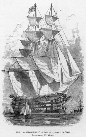 These experiments showed clearly that the screw was absolutely essential to every warship, as in a calm, the finest sailing ship would be at the mercy of any small steamer, armed with long-range guns. Thus while new vessels were laid down specially designed to carry screws, wherever it was found possible to do so, all the efficient battleships and frigates were fitted with auxiliary engines. Of course these converted sailing ships, not having been designed for the purpose, could only carry engines of small power, still, it was a case of half a loaf being better than no bread, and was the best that could be done under the circumstances.