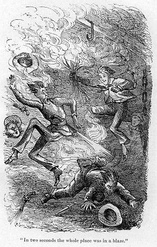 The men uttered a yell, and rushing forward, threw themselves on the smoking heap in the hope of smothering it at once. But Jack applied the torch quickly to various parts. The flames leaped up! The men rolled off in agony. Jack, who somehow had managed to break his chain, hopped after them, showering the blazing straw on their heads, and yelling as never mortal yelled before. In two seconds the whole place was in a blaze, and I beheld Jack actually throwing somersets with his one leg over the fire and through the smoke; punching the heads of the four men most unmercifully; catching up blazing handfuls of straw, and thrusting them into their eyes and mouths in a way that quite overpowered me. I could restrain myself no longer. I began to roar in abject terror! In the midst of this dreadful scene the roof fell in with a hideous crash, and Jack, bounding through the smoking débris, cleared the walls and vanished!