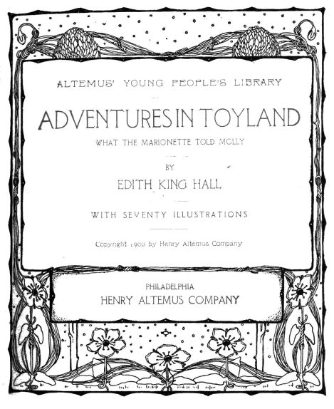 ALTEMUS’ YOUNG PEOPLE’S LIBRARY ADVENTURES IN TOYLAND WHAT THE MARIONETTE TOLD MOLLY BY EDITH KING HALL WITH SEVENTY ILLUSTRATIONS Copyright 1900 by Henry Altemus Company PHILADELPHIA HENRY ALTEMUS COMPANY |