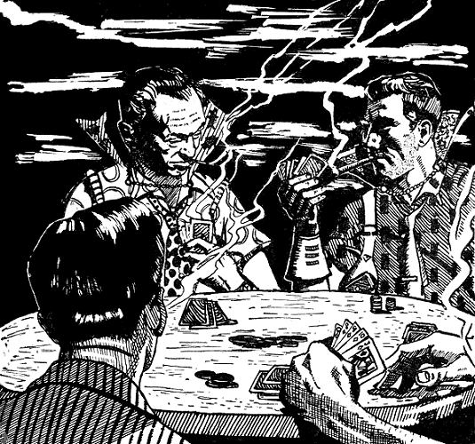 Phil Howland kept slipping open but he managed to close up before I could tell whether the combination of Three-Five-Two-Four meant a full house of fives over fours or whether he was betting on an open-ended straight that he hadn't bothered to arrange in order as he held them. The Greek was impenetrable; he also blocked me from reading the deck so that I could estimate his hand from the cards that weren't dealt out. Chicago Charlie's mind was easy to read but no one could trust him. He was just as apt to think high to score someone out as he was to think low to suck the boys in. As for me, there I was, good old Wally Wilson, holding a pat straight flush from the eight to the queen of diamonds. I was thinking "full house" but I was betting like a weak three of a kind.