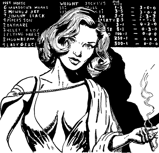 Behind us, Gimpy Gordon light-fingered a half dollar out of Delancey's pocket and was attracting the attention of a hot dog peddler by waving his program. Some folks nearby were eying Barcelona's noisemakers angrily but making very little visible protest once they identified him. Nora was reading her program and underlining some horses. The whole place began to grow into a strange excited silence as the track board began to go up. It was to be a nine-horse race, and at the top of the list were three—count them—three odds-on favorites: