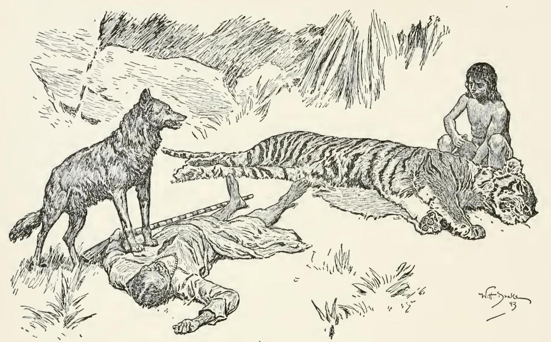“And it is I, Raksha [The Demon], who answers. The man’s cub is mine, Lungri—mine to me! He shall not be killed. He shall live to run with the Pack and to hunt with the Pack; and in the end, look you, hunter of little naked cubs—frog-eater—fish-killer—he shall hunt thee! Now get hence, or by the Sambhur that I killed (I eat no starved cattle), back thou goest to thy mother, burned beast of the jungle, lamer than ever thou camest into the world! Go!”