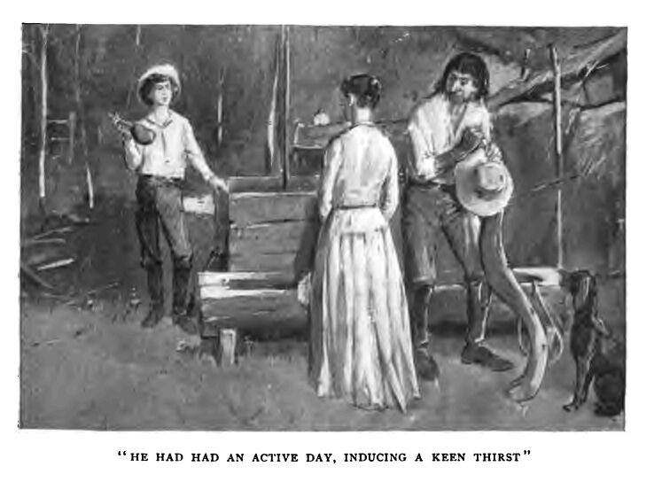 Leander stood staring at her out of his moonlit blue eyes, his hat far back on the brown curls she had so vaunted, damp and crisp and clinging, the low limp collar of his unbleached shirt showing his round full throat, one hand resting on the high curb of the well, the other holding a great brown gourd full of the clear water which he had busied himself in securing while she sought to prepare him to hear the worst. His lips, like a bent bow as she thought, were red and still moist as he now and then took the gourd from them, and held it motionless in the interest of her narration, that indeed touched him so nearly. Then, as she made point after point clear to his comprehension, he would once more lift the gourd and drink deeply, for he had had an active day, inducing a keen thirst.