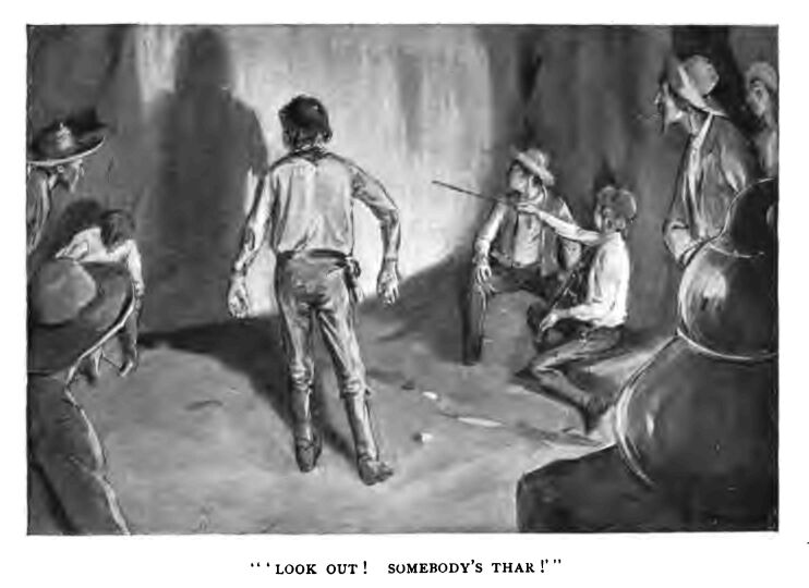 And thus reminded of the instrument, he picked it up, and once more, with the bow held aloft in his hand, he dexterously twanged the strings, and with his deft fingers rapidly and discriminatingly turned the screws, this one up and that one down. The earnest would-be musician, who had languished while the discussion was in progress, now plucked up a freshened interest, and begged that the furnace door might be set ajar to enable him to watch the process of tuning and perchance to detect its subtle secret. No objection was made, for the still was nearly empty, and arrangements tending to replenishment were beginning to be inaugurated by several of the men, who were examining the mash in tubs in the further recesses of the place. They were lighted by a lantern which, swinging to and fro as they moved, sometimes so swiftly as to induce a temporary fluctuation threatening eclipse, suggested in the dusk the erratic orbit of an abnormally magnified fire-fly. It barely glimmered, the dullest point of white light, when the rich flare from the opening door of the furnace gushed forth and the whole rugged interior was illumined with its color. The inadequate moonlight fell away; the chastened white splendor on the foam of the cataract, the crystalline glitter, timorously and elusively shifting, were annihilated; the swiftly descending water showed from within only a continuously moving glow of yellow light, all the brighter from the dark-seeming background of the world glimpsed without. A wind had risen, unfelt in these recesses and on the weighty volume of the main sheet of falling water, but at its verge the fitful gusts diverted its downward course, tossing slender jets aslant, and sending now and again a shower of spray into the cavern. Nehemiah remembered his rheumatism with a shiver. The shadows of the men, instead of an unintelligible comminglement with the dusk, were now sharp and distinct, and the light grotesquely duplicated them till the cave seemed full of beings who were not there a moment before—strange gnomes, clumsy and burly, slow of movement, but swift and mysterious of appearance and disappearance. The beetling ledges here and there imprinted strong black similitudes of their jagged contours on the floor; with the glowing, weird illumination the place seemed far more uncanny than before, and Leander, with his face pensive once more in response to the gentle strains slowly elicited by the bow trembling with responsive ecstasy, his large eyes full of dreamy lights, his curling hair falling about his cheek as it rested upon the violin, his figure, tall and slender and of an adolescent grace, might have suggested to the imagination a reminiscence of Orpheus in Hades. They all listened in languid pleasure, without the effort to appraise the music or to compare it with other performances—the bane of more cultured audiences; only the ardent amateur, seated close at hand on a bowlder, watched the bowing with a scrutiny which betokened earnest anxiety that no mechanical trick might elude him. The miller's half-grown son, whose ear for any fine distinctions in sound might be presumed to have been destroyed by the clamors of the mill, sat a trifle in the background, and sawed away on an imaginary violin with many flourishes and all the exaggerations of mimicry; he thus furnished the zest of burlesque relished by the devotees of horse-play and simple jests, and was altogether unaware that he had a caricature in his shadow just behind him, and was doing double duty in making both Leander and himself ridiculous. Sometimes he paused in excess of interest when the music elicited an amusement more to his mind than the long-drawn, pathetic cadences which the violinist so much affected. For in sudden changes of mood and in effective contrast the tones came showering forth in keen, quick staccato, every one as round and distinct as a globule, but as unindividualized in the swift exuberance of the whole as a drop in a summer's rain; the bow was but a glancing line of light in its rapidity, and the bounding movement of the theme set many a foot astir marking time. At last one young fellow, an artist too in his way, laid aside his pipe and came out to dance. A queer pas seul it might have been esteemed, but he was light and agile and not ungraceful, and he danced with an air of elation—albeit with a grave face—which added to the enjoyment of the spectator, for it seemed so slight an effort. He was long-winded, and was still bounding about in the double-shuffle and the pigeon-wing, his shadow on the wall nimbly following every motion, when the violin's cadence quavered off in a discordant wail, and Leander, the bow pointed at the waterfall, exclaimed: “Look out! Somebody's thar! Out thar on the rocks!”