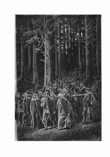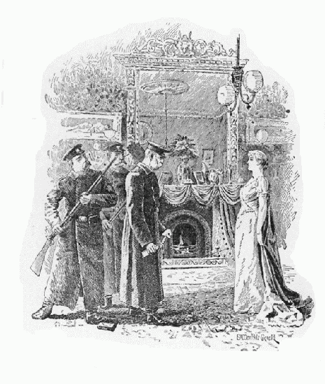 That evening I had come home rather late, and had then sat and chatted for a long while with aunt Vera, so that it was well towards midnight before I started to go to bed. Half-way upstairs, I was stopped by a noise; footsteps and stifled voices, mingled with the clang of spurs and sabres. I waited a moment,[Pg 82] to take breath, which had failed me suddenly; then I went back downstairs. A violent pull at the bell, an imperative pull, sounded at the garden gate; and in a moment was followed by another at the door of the house. It woke the old nurse, and brought my aunt Vera from her room. Having been a little forewarned by me of the possibility of such a visit as this, she questioned me with a frightened glance. I answered “Yes,” by a sign of the head, and begged her under my breath to delay “them” as long as possible before letting “them” come in. The idea of being able to render me a service, perhaps the last, gave her strength and courage; and while slowly, very slowly, she moved towards the door, where the nocturnal visitors were getting impatient and trying to force the lock, I went into the dining-room. A moment later I heard her sweet trembling voice assuring Monsieur le Colonel de Gendarmerie that there was no one in the house; all the family were at Moroznoië; my uncle had been in town on Monday, but had left again on Tuesday, and wouldn’t return till the end of next week; and there was no one here but herself, the speaker, and a young lady visiting her. In this little respite, which I had arranged for myself without too well knowing why, I remained inert in the room, lighted feebly by a single candle, and tried to gather my thoughts together: they were slow enough to respond to my efforts. My first notion was that of flight, and, automatically, I opened a window. Close at hand, behind some shrubbery, I perceived the glitter of a gendarme’s uniform. There would surely be others in the garden and in the courtyard; and for the[Pg 83] rest, fly—? How, and whither? I shut the window, and coming back to the middle of the room, I caught a glimpse of myself in the chimney-glass. I was very pale. Was I going to be a coward? This question, and that pale face in the mirror, awoke in me other thoughts, brought back to my memory other faces: that of my brother, who, a few months before, had gone so bravely from his home, to which he would never return, to the prison that he would perhaps never leave; those of friends lately arrested; those of so many, many noble men and women. Was I going to be a coward? So the examples set by these others turned my[Pg 84] attention from myself, calmed me, gave me strength. I could hear the voice of Colonel P——, who, impatient of my aunt’s parleying, briefly bade her hold her tongue, and conduct him to the presence of her niece, Mademoiselle Sophie. That voice, rude and gross, had the effect of changing the moral depression which I had felt a moment ago into a sort of intense nervous excitement; and at the moment when the Colonel, followed by his men, appeared upon the threshold of the dining-room, honouring me with the very least respectful of bows, I, instead of saluting him in return, met him with a gaze as fixed and haughty as his own.