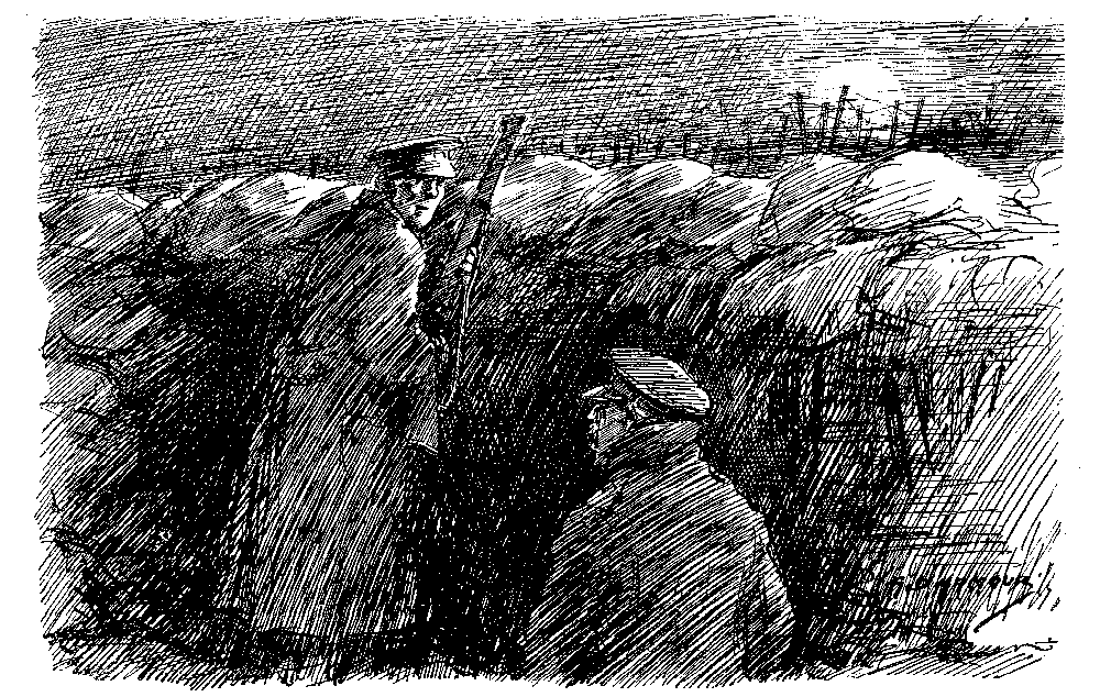 Sentry (who has been gazing steadily at wire entanglements), "All quiet, Sir, except them posts out there. If I watch 'em long enough they start forming fours.".