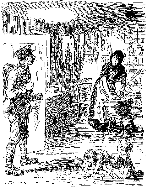 His Wife (with stoic self-control). "'Ullo, Fred. Better wipe yer boots before you come in—after them muddy trenches."
