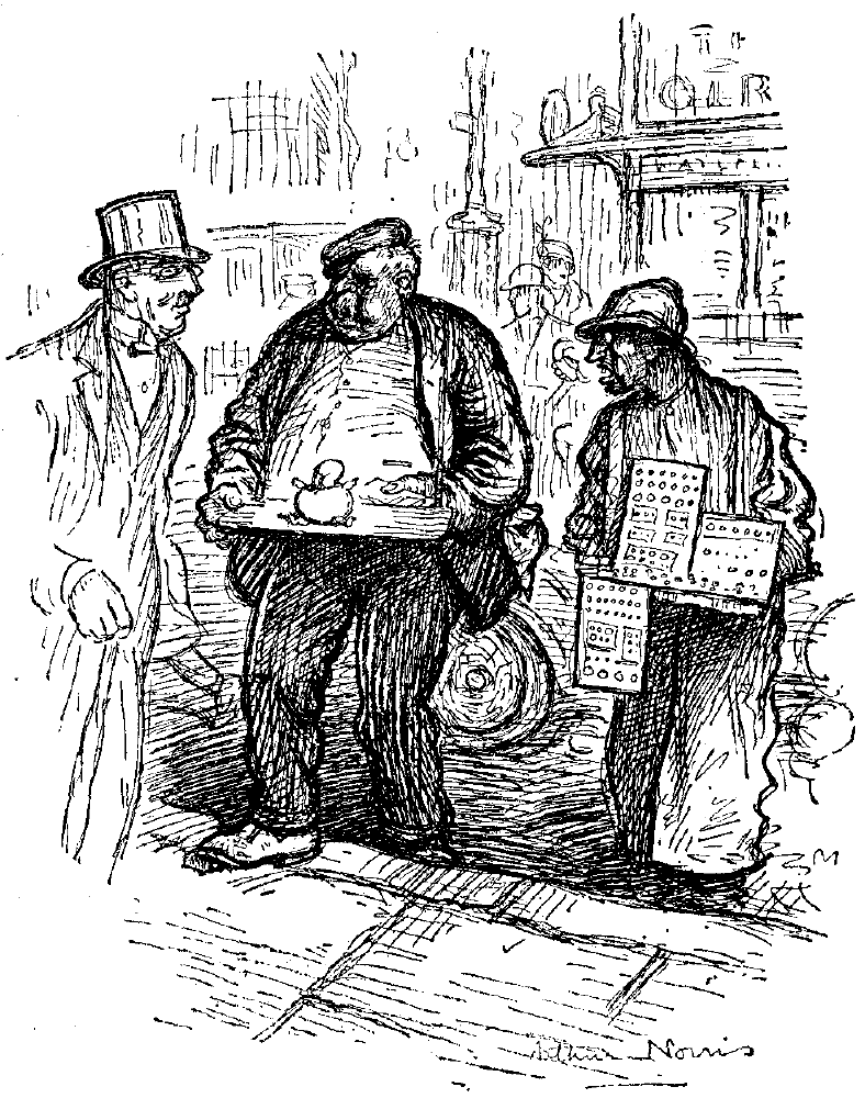 Vendor of studs and buttons (to vendor of inflating baby). "Now then, Father, not so much of it. Give an old batchiler a charnst, carn't yer?"