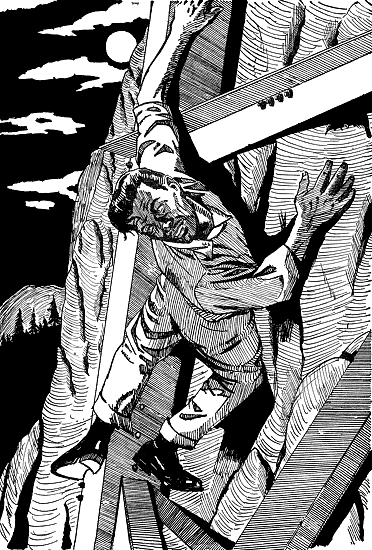 He got set ... and lifted. A thousand miles nearer the refuge! Got set ... and lifted, balanced over plunging gulfs. His reach found a round pilaster at the top, a perfect grip for a hand. He drew himself up, and this time his cleated foot cut through snow to stone, and slipped, but his hold was too good. And there he was.