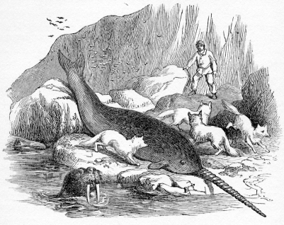 “I was very desirous to know how they managed to make their harpoon and spear heads, as I observed that they were all tipped with iron. So one day they took us over to a place they call Savisavick, which means ‘The Iron Place,’—the name being derived from a large block of meteoric iron, from which the savages chipped small scales; and these were set in the edges and tips of their harpoon and spear heads, just as I had done with my brass buttons. They also made knives in the same way. Many of their spear-handles were nothing more than narwhal horns, just like ‘Old Crumply’; and so you see how the Lord provides for all his creatures, endowing them all, whether white or black or copper-colored, with the same instinct of self-preservation, which leads them to seek and obtain for the security of their lives the materials that He places within their reach. How beautiful are all His works! and how constantly He watches over the rich and the poor, the savage and the Christian, the just and the unjust alike!247