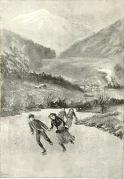Away they flew, the bright blades of their skates flashing in the long slanting rays of the late afternoon sun, and their eyes and cheeks glowing with the cold air and rapid exercise. Marjorie and her attendant knight were the first to reach the goal, and turned, panting, to face the others as they came up to them.