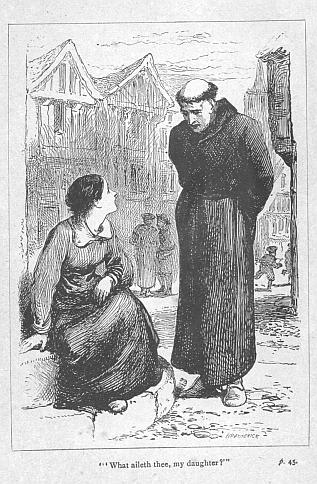 The day was drawing towards evening, when Agnes, as she turned round from emptying a pail of dirty water into the common sewer of Cow Lane, detected the burly figure of Father Dan, the Cordelier Friar, who was Mistress Winter’s family confessor, coming up from Seacoal Lane. Not without some fears of his errand, she waited till he came near, and then humbly louted—the ancient English reverence, now conventionally supposed to be restricted to charity children.