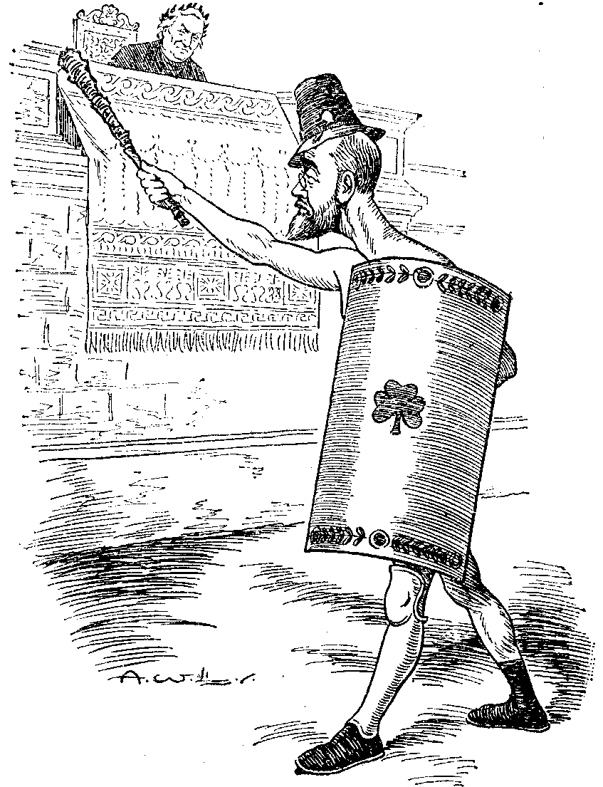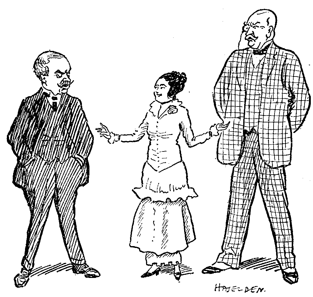 The scene (perhaps the best part of the whole show) was laid in "An Ancient Grove" adjacent to a German University. (The catalogue, peculiarly reticent about proper names, offers my memory no refreshment.) This "Ancient Grove," unchanged throughout the play, served a number of useful purposes. It made excuse for the intermittent apparition (otherwise inexplicable) of a little woodland figure that played upon a pipe. Its proximity to an hotel afforded occasion for meal after meal en plein air. Its proximity to a University Town encouraged the frequent passage of German students, vivacious and vocal; also the convenient appearance of any foreign resident or visitor at a moment's notice. Its Statue of Venus (fully draped) afforded an authentic incitement to the making of love. Its environs enabled Mr. Jerome to dispose of his puppets whenever their presence became undesirable. They simply said, "Let us stroll in the woods;" or "Come for a walk with me," and he was rid of them. Finally the "Ancient Grove" contained a central patch of boscage in whose cover one of the duellists, arriving on the terrain a little before the time, remained perdu in slumber, undisturbed by a loud conversation carried on within a few feet of him by all the other parties to the combat.