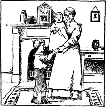 "Just see this apron-girl," she cries;— "Look at it's nose and button eyes." And now her frock with belt and fold Into another doll is rolled; She gives it to the rabbit boy, Who squeaks and stamps his foot with joy. |
