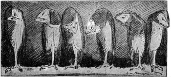 Yet, in spite of the opposition to Lord Arthur, the wave was due, and the affection for colour spread. The new century, at its birth, saw black relegated to the past—also to the future. This was midway in the Ebullient Age. Pent up for decades, mankind naturally began to slop over with sartorial enthusiasm. In 1920 its bizarrerie became offensive, and an opposition crusade was directed against it. Something had to be conceded. Trousers, which had been wavering between nautical buttons and gallooned knees—or, in the vernacular of the period, a sail three sheets in the wind and a flag at half-mast—were the items sacrificed. Knee-breeches enjoyed vogue for a time, but only for a time; for they vanished suddenly in 1930 and were replaced by tights or shapes. Boots made way for Elizabethan slippers. Hats had long since gone the way of the superannuated. Taught by the Darwinian theory, society discovered whence its tendency to baldness originated. They had recourse by degrees to flexible tiles of extraordinary cut.