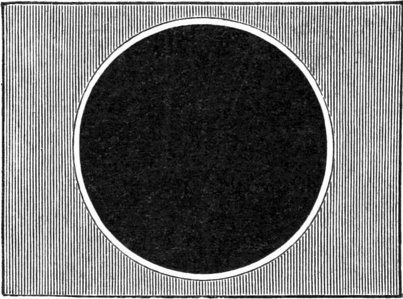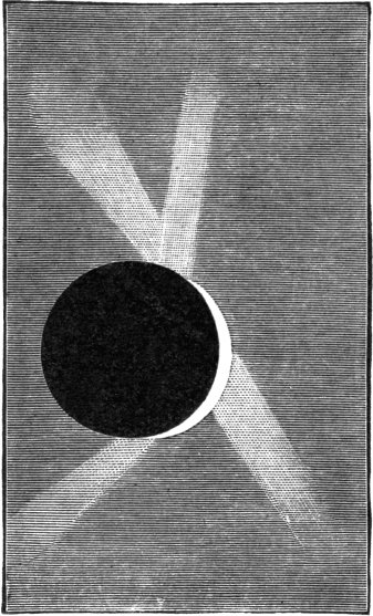 The idea will naturally suggest itself, what exactly does happen to the inhabitants living outside (on the one side or the other) of the strip of the Earth where the central line of shadow falls? This depends in every case on circumstances, but it may be stated generally that the inhabitants outside the central line but within 1000 to 2000 miles on either side, will see a larger or smaller part of the Sun concealed by the Moon’s solid body, simultaneously with the total concealment of the Sun to the favoured individuals who live, or who for the moment are located, within the limits of the central zone.