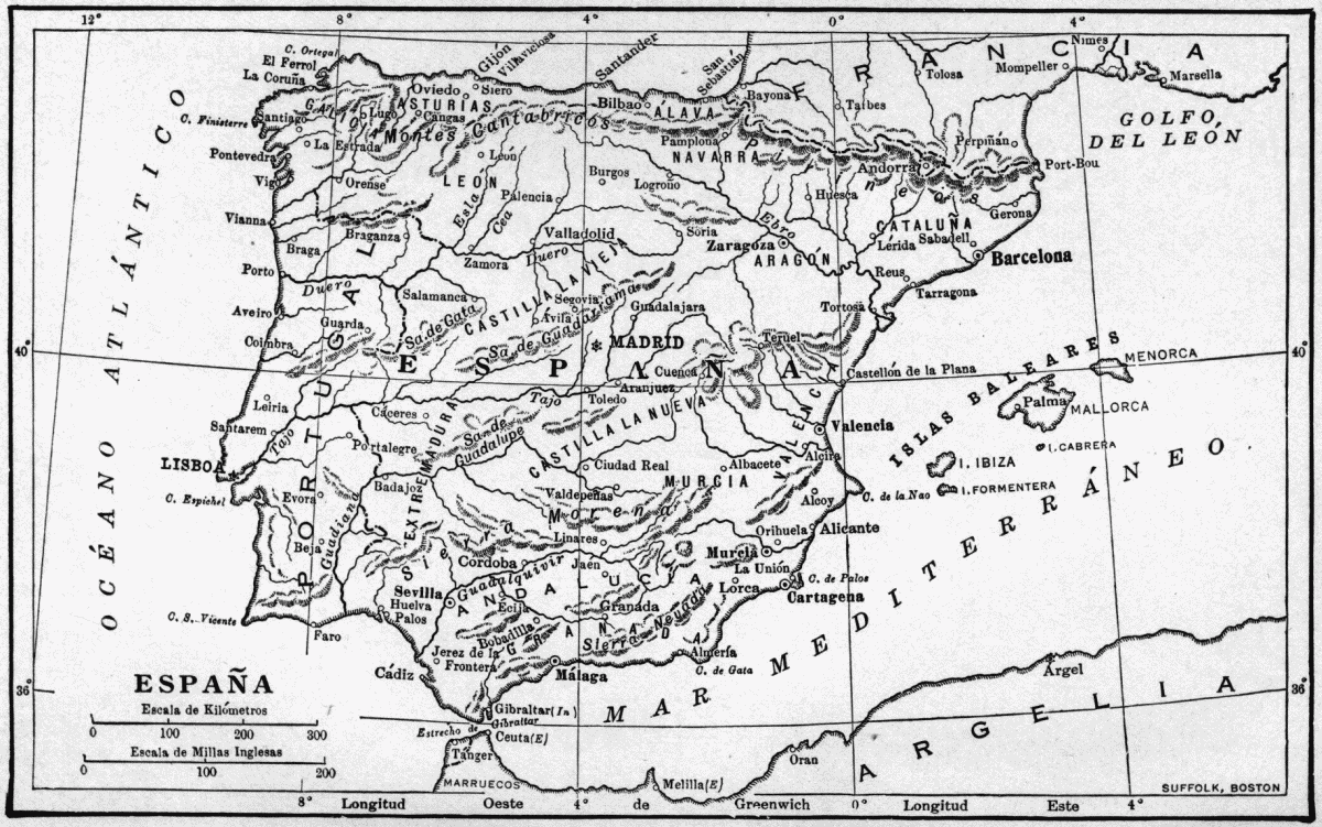 Mapa de España[Transcriber's note: The spelling and accentuation of the Spanish in the original, hard book have been retained. A small number of words which appear here with accent are no longer accented in modern-day Spanish: vi (ví) vio (vió) fui (fuí) fue (fué) and dio (dió) construido (construído) heroica (heróica).]