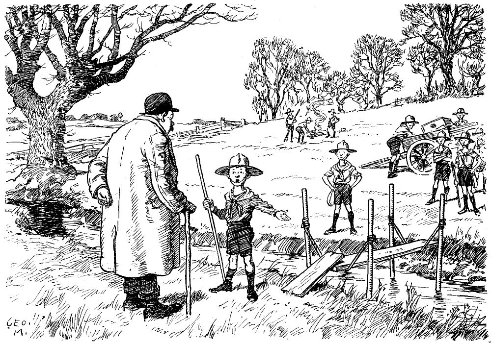 Zealous Boy Scout. "You can cross by this bridge, Sir. It will save you a long walk round."