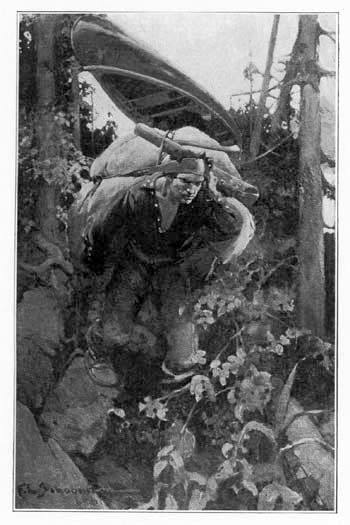 As we rattled along the road the farms grew poorer and sparser, until at last we came into the woods, crossed the rocky Passadumkeag River, and so over a succession of horseback hills to the landing-place on Nicatöus Stream, where the canoes were hidden in the bushes. Now load up with the bundles and boxes, the tent, the blanket-roll, the clothes-bag, the provisions—all the stuff that is known as "duffel" in New York, and "butins" in French Canada, and "wangan" in Maine—stow it all away judiciously so that the two light craft will be well balanced; and then push off, bow paddles, and let us taste the joy of a new stream! New to the boy and me, you understand; but to the guides it was old and familiar, a link in a much-travelled route. The amber water rippled merrily over the rocky bars where the river was low, and in the still reaches it spread out broad and smooth, covered with white lilies and fringed with tall grasses. All along the pleasant way Sam entertained us with memories of the stream.