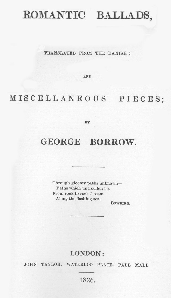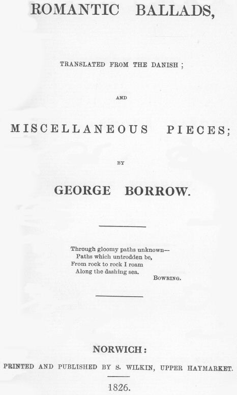 George Borrow commenced his literary career with a translation of Klinger’s “Faustus” in 1825, and by a compilation of “Celebrated Trials” in the same year. Both these books appeared in London while he was engaged as a bookseller’s hack, as described in “Lavengro.” In 1826 Borrow returned to Norwich, and there he issued from the printing-house of S. Wilkin, in the Upper Haymarket, these “Romantic Ballads.” He had worked hard at collecting subscribers, and two hundred copies were reserved for Norwich at half a guinea each copy; the remaining three hundred out of an edition of five hundred were sent to London. Some of these bear the imprint of John Taylor, Waterloo Place, Pall Mall, 1826, while the remainder bear the imprint of Wightman & Cramp, of Paternoster Row, in the same year. Dr. Knapp only knew of the Taylor edition, because that is referred to in the correspondence. Copies, however, of the Wightman & Cramp edition are in existence, and the title-page will be found reproduced with those of the first and second issue in the opening pages of this volume. Borrow sent copies to Lockhart, and Cunningham advised gifts to other reviewers; but not a single review of the book appeared. Yet his subscription list “amply paid all expenses,” as Borrow states in a letter to Cunningham. That list reveals the fact that such diverse persons as Dr. Bathurst, Bishop of Norwich, and Thurtell, the murderer of Mr. Weare, were among the Norwich subscribers, while Benjamin Haydon, John Timbs, and Thomas Campbell paid their half-guineas from London. Thurtell, we may add, was hanged before the book appeared.
