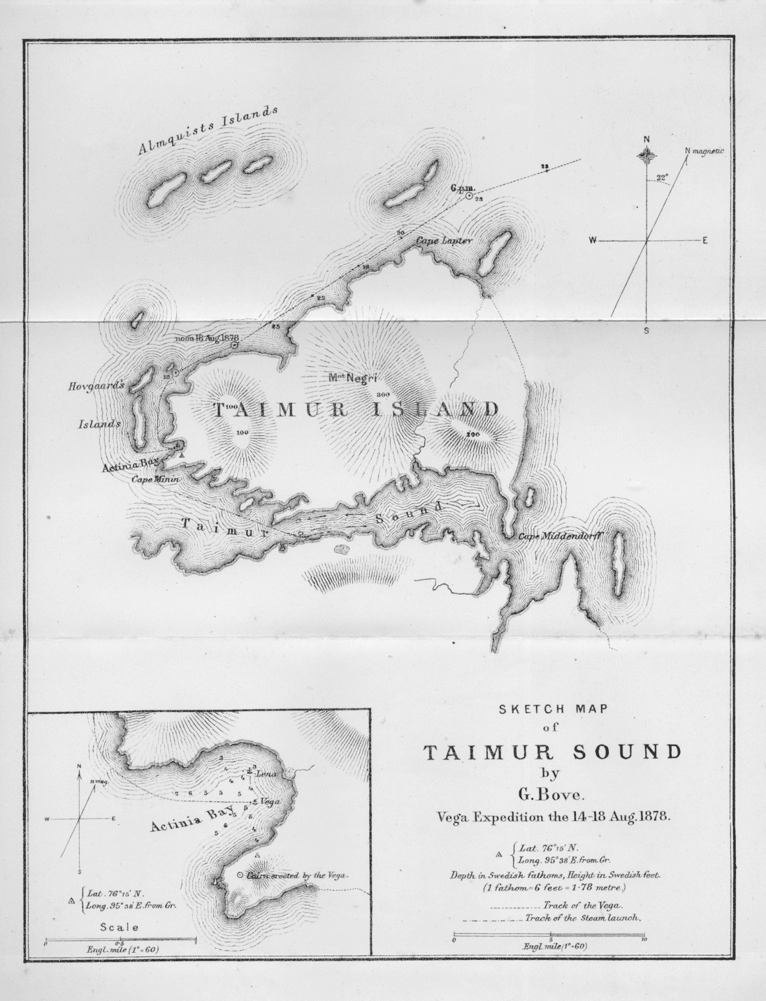 Map of the North Coast of the Old World from Norway to Behring's Straits, with the track of the Vega, constructed from old and recent sources, and from observations made during the Voyage of the Vega, by N. Selander, Captain in the General Staff