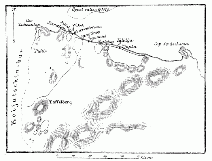 In the work now published I have, along with the sketch of the voyage of the Vega round Asia and Europe, of the natural conditions of the north coast of Siberia, of the animal and vegetable life prevailing there, and of the peoples with whom we came in contact in the course of our journey, endeavoured to give a review, as complete as space permitted, of previous exploratory voyages to the Asiatic Polar Sea. It would have been very ungrateful on my part if I had not referred at some length to our predecessors, who with indescribable struggles and difficulties—and generally with the sacrifice of health and life—paved the way along which we advanced, made possible the victory we achieved. In this way besides the work itself has gained a much-needed variety, for nearly all the narratives of the older North-East voyages contain in abundance what a sketch of our adventures has not to offer; for many readers perhaps expect to find in a book such as this accounts of dangers and misfortunes of a thousand sorts by land and sea. May the contrast which thus becomes apparent between the difficulties our predecessors had to contend with and those which the Vega met with during her voyage incite to new exploratory expeditions to the sea, which now, for the first time, has been ploughed by the keel [pg xi] of a sea-going vessel, and conduce to dissipate a prejudice which for centuries has kept the most extensive cultivable territory on the globe shut out from the great Oceans of the World.