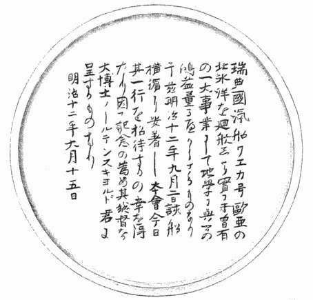 [396] The medal was accompanied by an "extrait du registre de procès-verbaux du conseil municipal de la ville de Paris," a caligraphic masterpiece illuminated in various colours and gold. The Conseil municipal also ordered a detailed description of the fête to be printed, with the title Relation officielle de le réception de M. le Professeur Nordenskiöld par le conseil municipal de Paris le lundi 5 Avril 1880.