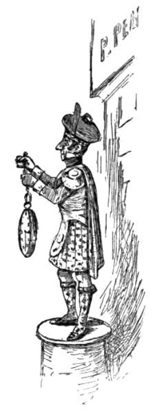 Now, what the Admiral was staring at was a mystery. He might, for instance, have been looking at the wooden Highlander that stood at the door of Mr. Pendle's instrument-shop, for nothing more magnificent than this particular Highlander could possibly be imagined. His clothes were of every color of the rainbow, and he had silver buckles on his shoes, and brass buttons on his coat, and he was varnished to such an extent that you could hardly look at him without winking. Then his hair and his whiskers were so red, and his legs were so pink and so fat and so lifelike, that it seemed as if you could almost hear him speak; and, what was more, he had been standing for years at the door of the shop, proudly holding up a preposterous[Pg 15] wooden watch that gave half-past three as the correct time at all hours of the day and night. In fact, it would have been no great wonder if the Admiral had stared at him to the end of his days.