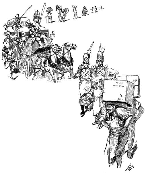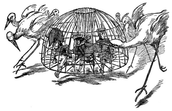 The cage proved to be an enormous rat-trap, and the Caravan, with remarkable presence of mind, had put their legs through between the wires at the bottom of it, and were walking briskly along, holding up the cage with their hands. The news of this extraordinary performance had evidently been spread abroad, as the Ferryman and a number of serious-looking storks were escorting the Caravan with an air of great interest, and occasionally taking to their heels[Pg 133] when the Admiral chanced to look at them through the wires with his spy-glass. There was a door, to be sure, in the side of the trap, quite big enough for the Admiral, and Sir Walter, and the Highlander to come out of, all in a row if they liked, but they evidently hadn't noticed this—"and I'm not going to tell 'em about it, just yet," said Dorothy to herself, "because they deserve to be punished for their capers. But it's really quite clever of 'em to put their little legs through in that way," she went on, "and extremely convenient—that is, you know," she added thoughtfully, "so long as they all want to go the same way"; and, with this wise reflection, she scrambled over the wall and ran after the procession.