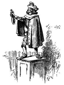 Then there was Sir Walter Rosettes, a long-bodied little man in a cavalier's cloak, with a ruff about his neck and enormous rosettes on his shoes, who stood on a pedestal at old Mrs. Peevy's garden gate, offering an imitation tobacco-plant, free of charge, as it were, to any one who would take the trouble of carrying it home. This bold device was intended to call attention to the fact that Mrs. Peevy kept a tobacco-shop in the front parlor of her little cottage behind the hollyhock bushes, the announcement being backed up by the spectacle of three pipes arranged in a tripod in the window, and by the words "Smokers' Emporium" displayed in gold letters on the glass; and, by the way, Dorothy knew[Pg 16] perfectly well who this little man was, as somebody had taken the trouble of writing his name with a lead-pencil on his pedestal just below the toes of his shoes.