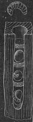 [3] "Since writing the above I have opened one of the new holes of Xylocopa, which was commenced between three and four weeks ago, in a pine slat used in the staging of the greenhouse. The dimensions were as follows:—Opening fully 3-8 wide; depth 7-16; whole length of tunnel 6 5-16 inches. The tunnel branched both ways from the hole. One end, from opening, was 2 5-8, containing three cells, two with larva and pollen, the third empty. The other side of the opening, or the rest of the tunnel, was empty, with the exception of the old bee (only one) at work. I think this was the work of one bee, and, as near as I can judge, about twenty-five days' work. Width of tunnel inside at widest 9-16 inch.