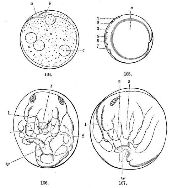 [25] Leuckart, in his great work, "Die Menschlichen Parasiten," p. 700, after the analogy of Hirudo, which develops a primitive streak late in larval life, ventures to consider the first indications of the germ of Nemertes in its larval, Pilidium form as a primitive streak. He also suggests that the development of the later larval forms of the Echinoderms is the same in kind.