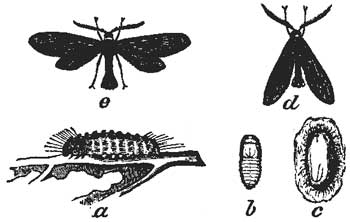 When the caterpillar has ended its riotous life, for its appetite almost transforms its being into the very incarnation of gluttony, it suddenly, as if repenting of its former life as a bon vivant, seeks a solitary cell or hole where like a hermit it sits and leads apparently about as useless an existence. But meanwhile strange processes are going on beneath the skin; and after a few convulsive struggles the back splits open, and out wriggles the chrysalis, a gorgeous, mummy-like form, its body adorned with golden and silvery spots. Hence the word chrysalis (Fig. 14, b), from the Greek, meaning golden, while the Latin word pupa, meaning a baby or doll, is indicative of its youth. In this state it hangs suspended to a twig or other object; while the silk worm, and others of its kind, previous to moulting, or casting their skins, spin a silken cocoon, which envelops and protects the chrysalis.