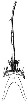 [7] Figure 111 represents the parts of the mouth in a large specimen of Pediculus vestimenti, entirely protruding, and seen from above, magnified one hundred and sixty times; aa, the summit of the head with four bristles on each side; bb, the chitinous band, and c, the hind part of the lower lip, such as they appear through the skin by strong transmitted light; dd, the foremost protruding part of the lower lip (the haustellum); ee, the hooks turned outwards; f, the inner tube of suction, slightly bent and twisted; the two pairs of jaws are perceived on the outside as thin lines; a few blood globules are seen in the interior of the tube.