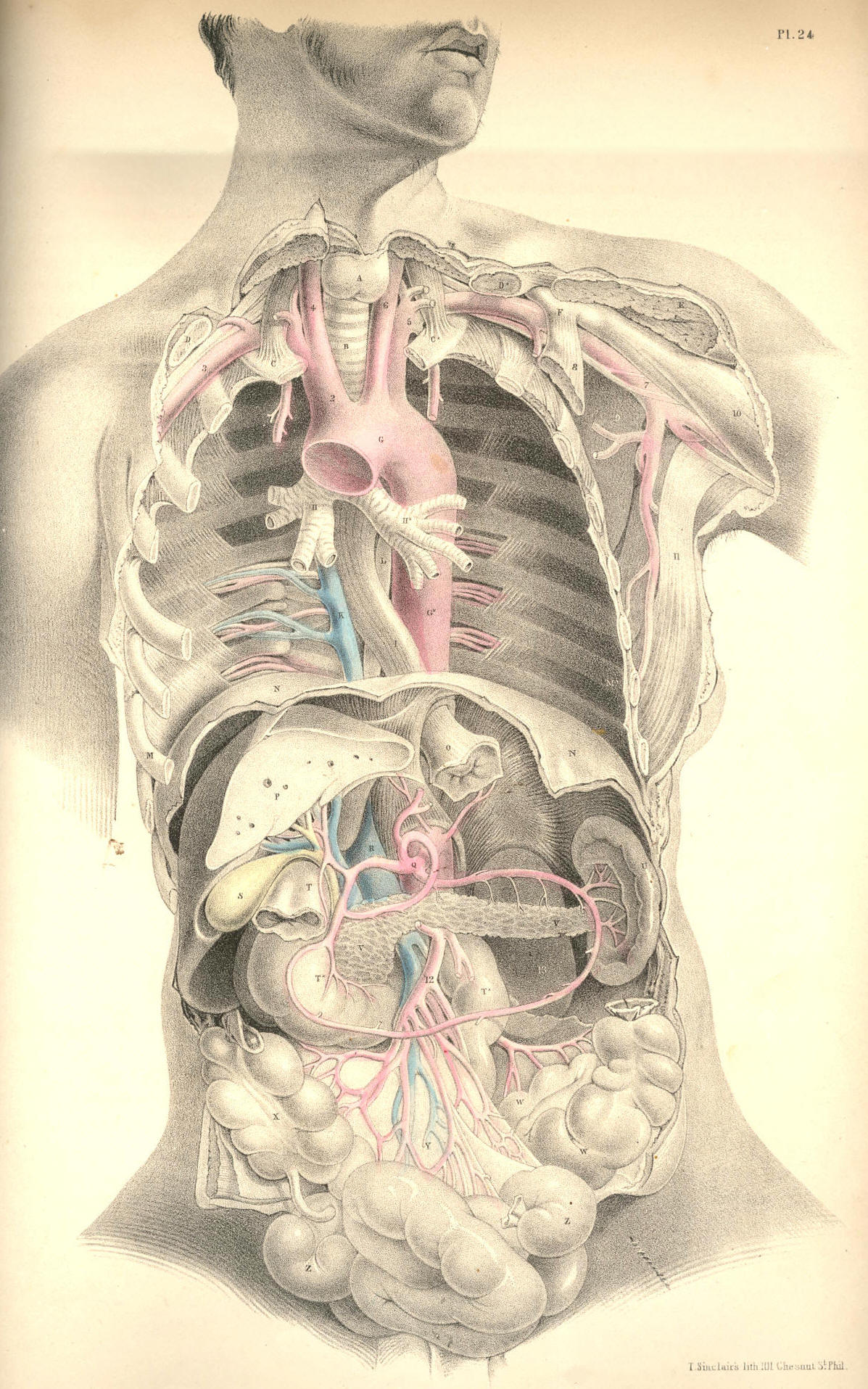thoracic duct, L; the oesophagus, I; the superior vena cava, H, Plate