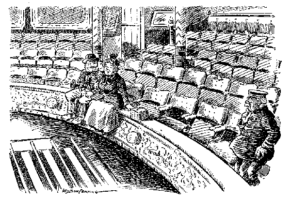 In spite of all you can do in the way of avoiding soliloquies and getting your characters on and off the stage in a dramatic manner, a time will come when you realise sadly that your play is not a bit like life after all. Then is the time to introduce a meal on the stage. A stage meal is popular, because it proves to the audience that the actors, even when called George Alexander or Arthur Bourchier, are real people just like you and me. "Look at Sir Herbert eating," we say excitedly to each other in the pit, having had a vague idea up till then that an actor lived like a god on praise and grease-paint and his photograph in the papers. "Another cup, won't you?" says Miss Gladys Cooper; "No, thank you," says Mr. Dennis Eadie—dash it, it's exactly what we do at Twickenham ourselves. And when, to clinch matters, the dramatist makes Mr. Gerald du Maurier light a real cigarette in the Third Act, then he can flatter himself that he has indeed achieved the ambition of every stage writer, and "brought the actual scent of the hay across the footlights."