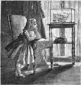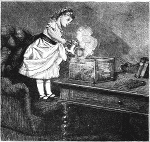 So she took the jug, mounted into the arm-chair, and poured the whole jugful of water on the fish. It made them very lively; and Bessie put down the jug, jumped off the chair, and got a stool to stand on to watch the little things through the glass.[116]