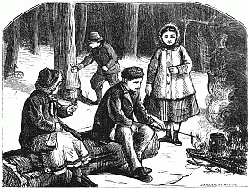 For making sugar the sap of the maple-tree is used. But how is the sap got from the trees? and how is it made into sugar? I will tell you.[126] A hole is bored in each tree, a spout put in the hole, and a bucket is placed underneath. This is called "tapping the tree." The sap runs from the tree into the bucket, drop by drop, until it is full. Then the sap is boiled till it becomes sirup; and the sirup is boiled into sugar.