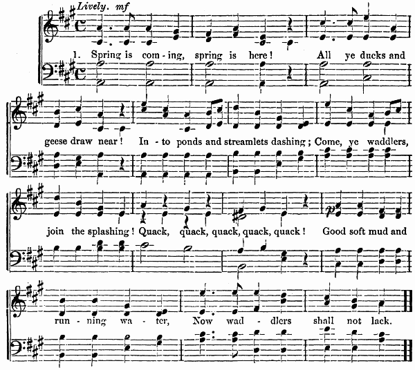 | Now the snows are melting, going, Now the little streams are flowing; Buds are swelling, birds are singing, Odors sweet the wind is bringing; Quack, quack, quack, quack, quack! Good soft mud and running water, Now waddlers shall not lack. | Little girls and boys are straying, Or in sunny meadows playing, Seeking buttercups and clover, While their hearts with joy run over; But—what goose can't see it plainly?— Spring for us is given mainly. Quack, quack, &c. |