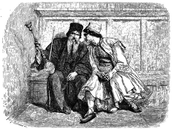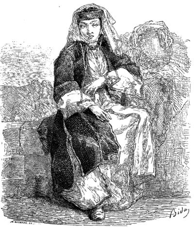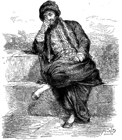 Au milieu des Bulgares et des Grecs, confondus par un costume noir comme un vêtement de deuil, on reconnaît les juifs à leur coiffure faite d'un mouchoir de coton roulé en turban, à leur veste bordée de fourrures, et surtout à ce nez proéminent qu'ils ont conservé (p. 104) sous toutes les latitudes. Leurs femmes ont un accoutrement qui rappelle les modes du Directoire: un diadème en carton, recouvert de métal et serré sous la mâchoire par une étoffe légère, leur cache complétement les cheveux, fait saillir les joues et ressortir la pâleur mate de leur visage. Une robe de laine frangée en dents de scie, retenue sous les seins par une ceinture agrafée d'or, accuse les formes et laisse voir les pieds chaussés de babouches ou de brodequins lacés.