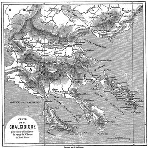 Note 1: Salonique, ancienne Thermès ou Thessalonique. Philippe avait donné le nom de Thessalonique à sa fille en mémoire d'une victoire remportée sur les Thessaliens (θεσσαλος, Thessaliens; νικη, victoire), et Cassandre, gendre de Philippe, fit donner le nom de sa femme à la ville de Thermès.[Retour au texte principal.]