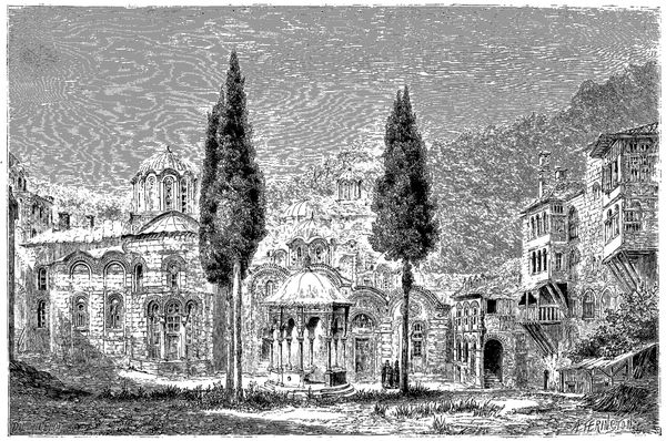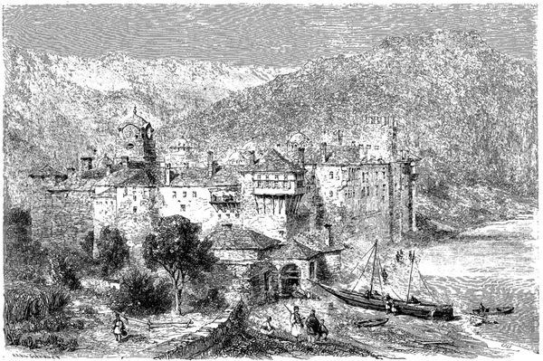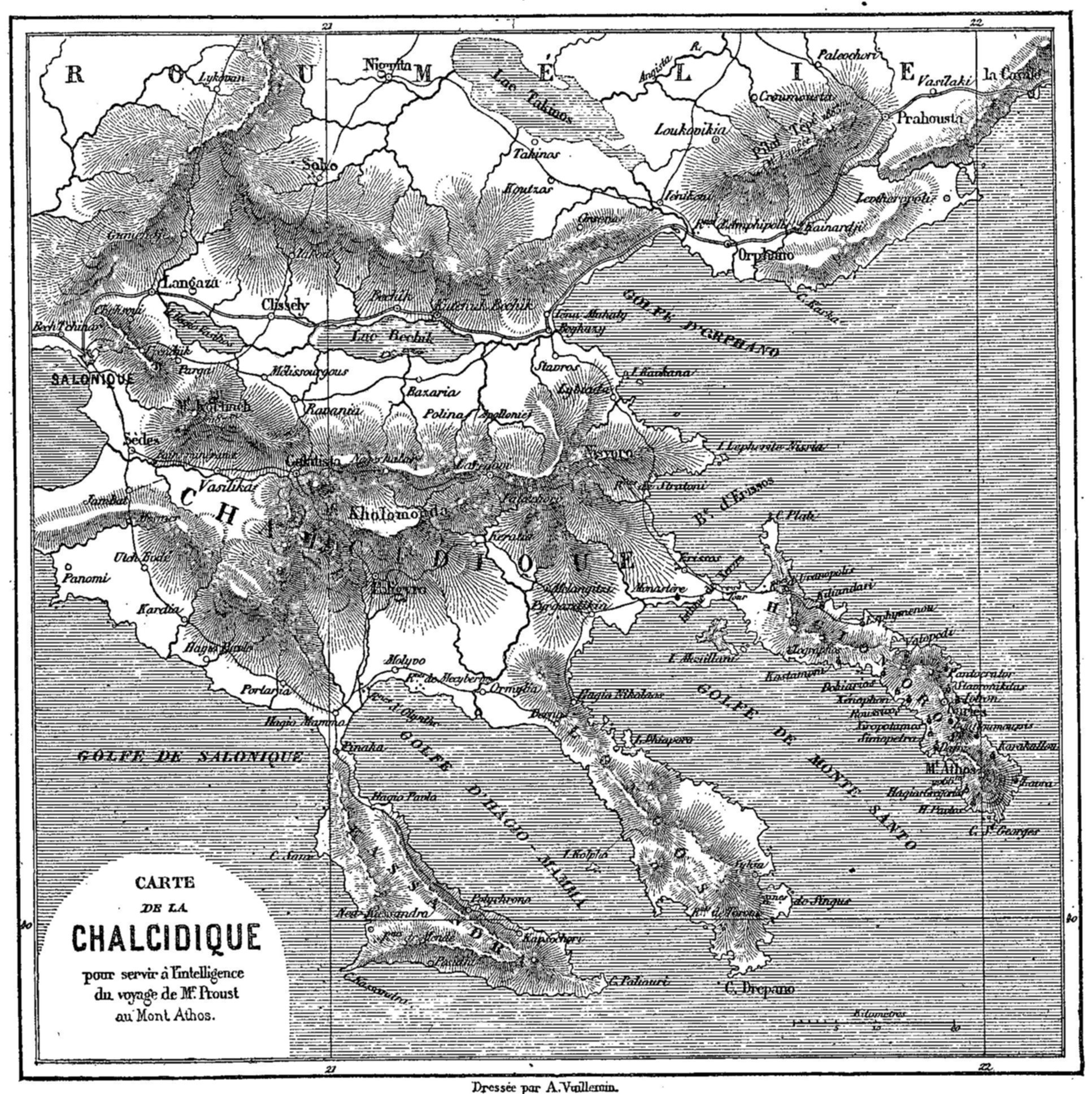 À l'extrémité de la péninsule Chalcidique, entre Orfano et le cap Felice, s'élève au-dessus de la mer une montagne, connue chez les anciens sous le nom d'Athos, et appelée depuis Ἁγιονορος ou Monte-Santo, à cause de sa population exclusivement composée de religieux. Ces religieux, sous les empereurs byzantins, ont aidé au mouvement des lettres et des arts qui prépara la Renaissance, et possèdent encore aujourd'hui de riches bibliothèques et une école de peinture.