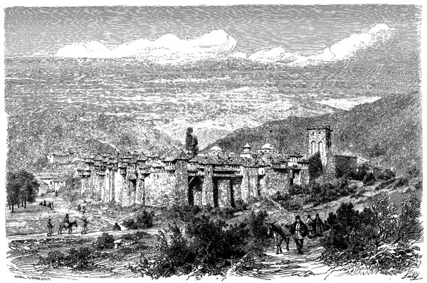 À mesure qu'on s'éloigne de la mer, les habitations deviennent rares, le myrte pousse librement dans cette terre féconde que méprise la charrue, et ce n'est qu'à Galatz qu'on retrouve l'agriculture et son cortège mugissant: Galatz est adossé au mont Disoron, au fond d'un cirque gigantesque. Ses maisons, éparpillées sur le rocher, et surmontées d'une énorme tour qui projette dans la vallée son ombre trapue et massive, lui donnent l'aspect d'une petite ville....