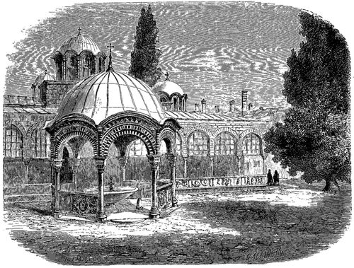Note 31: Cette fontaine est appelée par Eusèbe basilicæ lavacrum. C'est là que les premiers chrétiens faisaient les ablutions exigées avant d'entrer dans le temple, usage conservé par Mahomet dans le Koran. Cette fontaine servait aussi de baptistère et était séparée de l'église, comme cela se voit encore dans certaines villes de l'Italie. La veille de l'Épiphanie on y fait la bénédiction solennelle de l'eau en mémoire du baptême de Jésus-Christ.[Retour au texte principal.]
