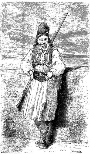 Les deux zaptiés ouvraient la marche. L'accoutrement des bachi-bozouks varie selon le caprice de chacun. Ceux-là portaient la veste albanaise couleur lie de vin rehaussée de broderies noires, le pantalon large resserré au genou et le turban conique: un arsenal d'armes de toute sorte chargeait leurs ceintures. Les armes sont le luxe des Albanais, et leur vanité à cet endroit ne s'arrête qu'à la limite de leurs moyens pécuniaires, limite qui chez les bachi-bozouks n'est précisée que par leur plus ou moins d'aptitude au pillage. De nombreux καλη ὡρα (bonne heure), καλη ἡμερα (bon jour), augourler ola (p. 107) (que les augures soient bons), nous étaient adressés par les curieux que le bruit de ce convoi de tchelebis avait attirés sur leurs seuils.