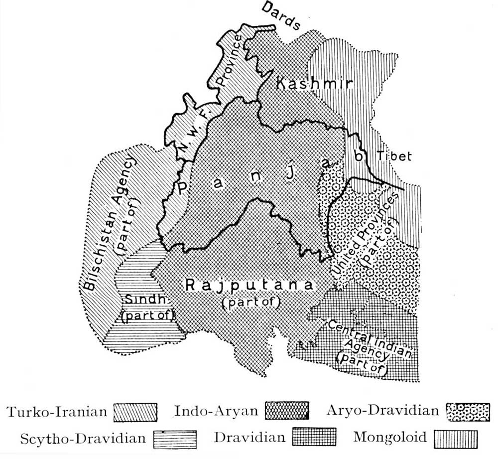The term Punjábi much more nearly, but still imperfectly, covers the people of the Panjáb, the North-West Frontier Province, Kashmír and the associated smaller Native States. The Sikh, Muhammadan and Hindu Jats, the Kashmírís and the Rájputs all belong to the tall, fair, leptorrhine Indo-Aryan main stock of the area, merging on the west and south-west [Pg vi]into the Biluch and Pathán Turko-Iranian, and fringed in the hill districts on the north with what have been described as products of the "contact metamorphism" with the Mongoloid tribes of Central Asia. Thus, in spite of the inevitable blurring of boundary lines, the political divisions treated together in this volume, form a fairly clean-cut geographical unit.
