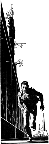 "Wait until I finish," said Jenner, curtly. "I hired you to test-hop our new ship because you were the best pilot available. I'm not interested in [136] your past, but most of the company's resources are sunk in that ship. If something goes wrong because the test pilot is disturbed or nervous, the company will be bankrupt. I'm not saying you're an escaped prisoner, but if you were, you'd have nothing to worry about."